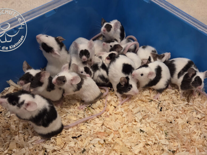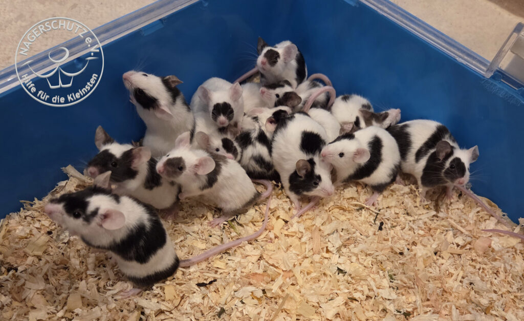 Anfang Dezember kontaktierte uns eine verzweifelte Halterin, die ursprünglich 6 Weibchen aufgenommen hatte und die Tiere liebevoll umsorgte. Leider entpuppte sich eine Maus als Böckchen und auch, wenn der Bock aus der Gruppe genommen wurde und mit männlicher Gesellschaft versorgt wurde, nahm das Schicksal bereits seinen Lauf. Es wurden mehrere Würfe geboren und die Situation wuchs der Halterin schließlich über den Kopf. Kurz entschlossen zogen also insgesamt 63 Mäuse in unsere Pflegestelle ein.